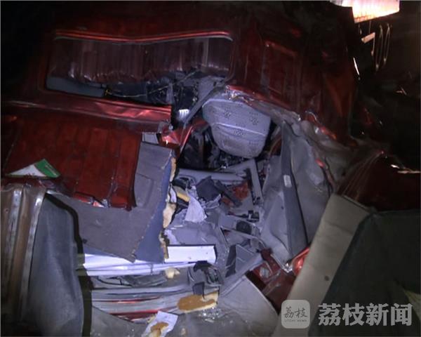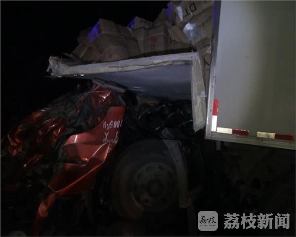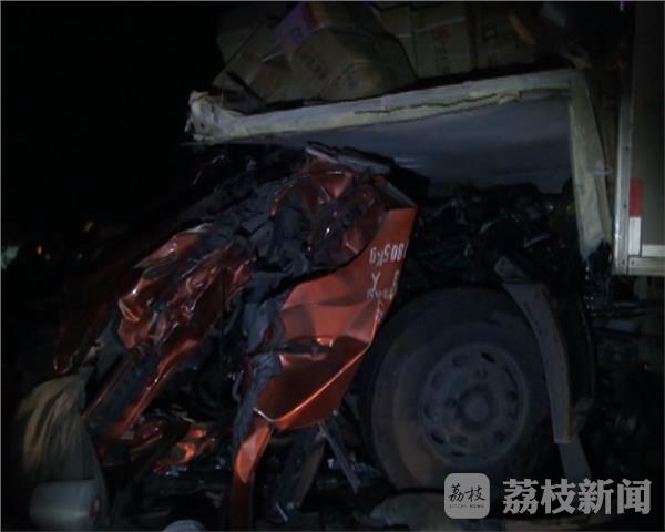 荔枝新闻通讯员赶到现场时,119己经把卡在变形驾驶员内的二名驾驶员拉了出来,120把一位受伤严重的驾驶员送到医院抢救,还有一位驾驶躺在路边,经120医生诊断己经死亡。在现场可以看到,这辆由南向北的山东牌号的大货车的驾驶室已全部报废,地上到处是追尾车上坠落的货物和驾驶室的玻璃及机油,在前面三十米的地方停着一辆大货车,后面也被撞了变形,备用轮胎也被撞破。