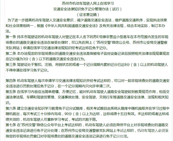 荔枝新闻记者今天(10月9日)从苏州市交管部门获悉,自10月31日起,苏州市机动车驾驶人在处理非现场处罚的道路交通安全违法行为时,可通过在网上学习,并在考试达标后免于记分。
