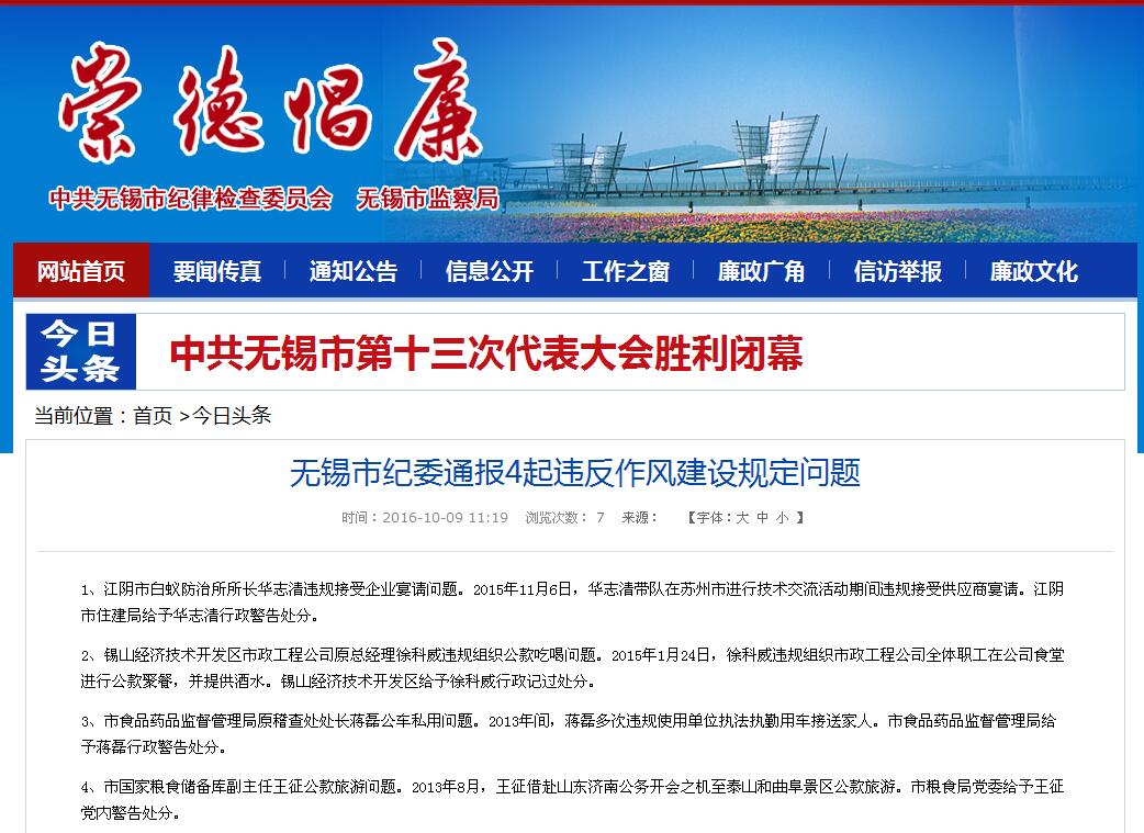 1、江阴市白蚁防治所所长华志清违规接受企业宴请问题。2015年11月6日,华志清带队在苏州市进行技术交流活动期间违规接受供应商宴请。江阴市住建局给予华志清行政警告处分。