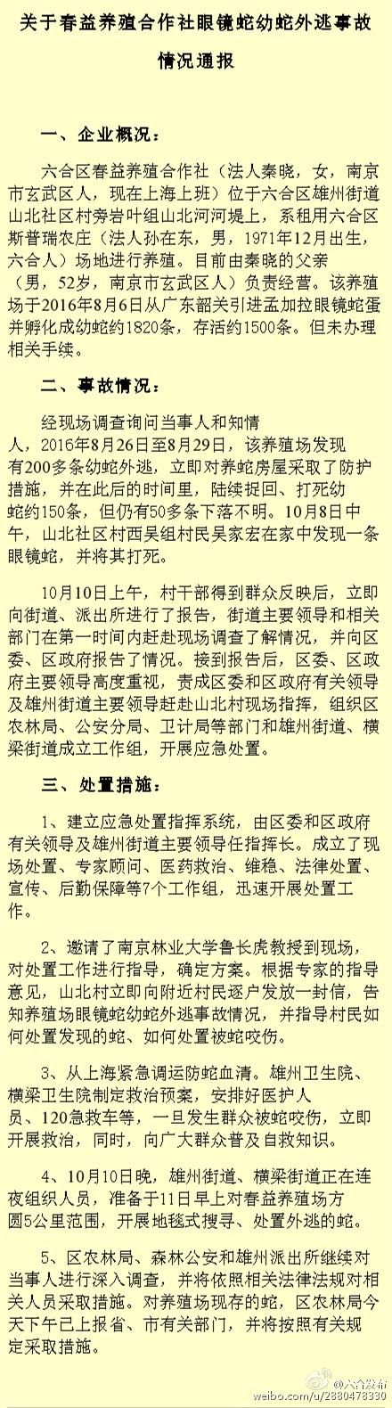 对此,六合区雄州街道办事处发布通报称确有其事。通报称,10月10日上午8点,南京六合雄州街道一养殖场200多条眼镜蛇出逃,养殖场随即报警,并向街道汇报。随后展开追逃,目前已追回140多条,仍有50多条在逃,街道立即发出通知,告知市民如何防范。据了解,六合卫计部门已经成立应急救治小组,并从上海调来血清,六合区人民医院为定点救治,成立专家小组,如遇被咬伤立即拨打120。
