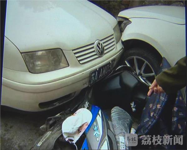 付女士被撞后倒在电动车下,随后被路人从车轮下救了出来,付女士手捂着受伤的右腿,坐在路边等待120救援。