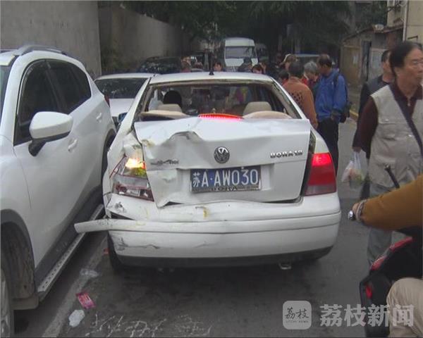 今天早晨八点钟左右,南京一辆53路公交车在由西向东方向行驶时与一辆黄色事故救援车发生追尾,随后救援车又撞上一辆白色大众轿车,大众轿车又撞上一骑电动车的女子并将该女子顶出十多米远,大众轿车直到撞到路边的一辆白色轿车才停了下来。