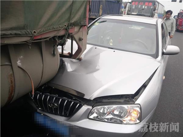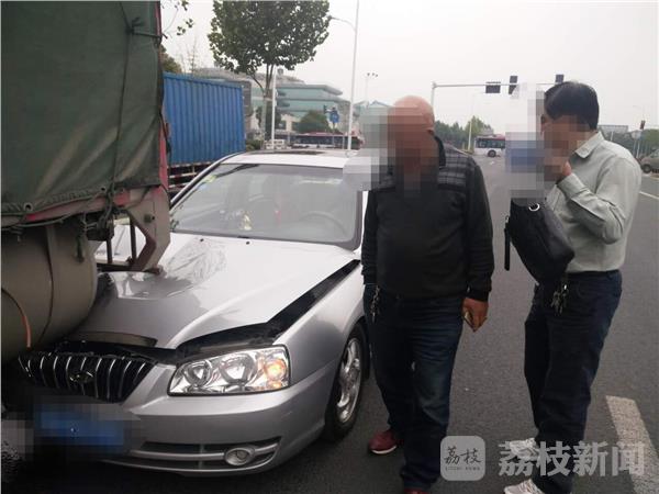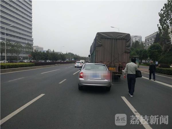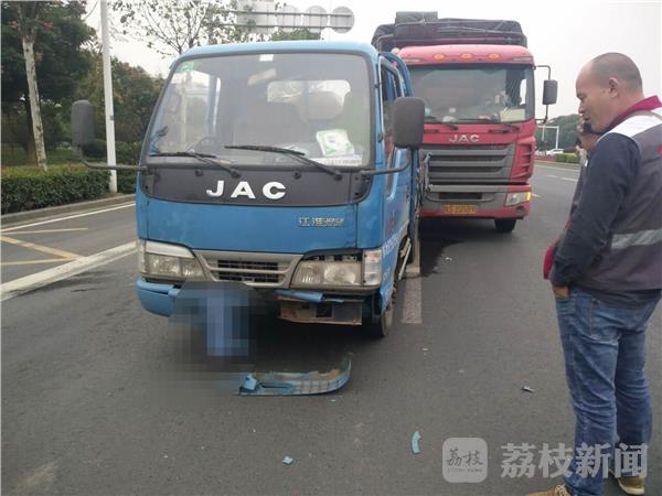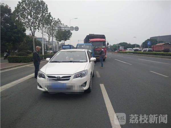 据陈先生介绍,今天早晨十点多,在103国道南京高新园区段一辆白色小车打着方向灯,缓缓地向路边停靠欲进行临时停车,而紧跟白色小车身后的蓝色卡车司机正在一边打电话一边驾车,因车速较快来不及避让一下将白色小车撞向了前方,而蓝色卡车后面的红色卡车也因车距太近,事故发生突然,又一下撞上了蓝色卡车的车厢,据白色小车的驾驶员李师傅称,他刚感觉到车子后面被撞了一下还没反应过来,就感觉又被撞了一下。