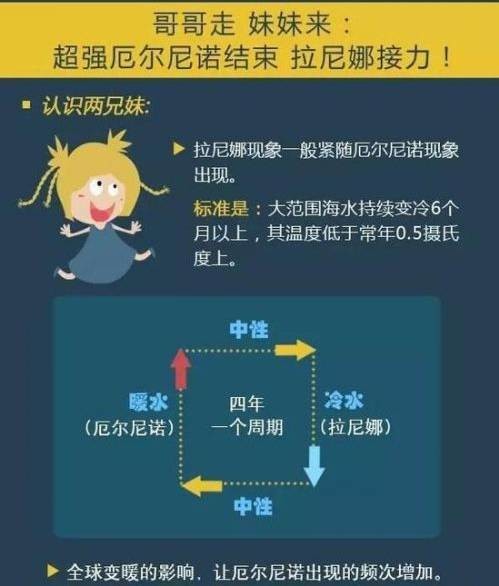 我们对拉尼娜还有些陌生,但一定比较熟悉她的“哥哥”厄尔尼诺,今年超强的厄尔尼诺现象令许多地方苦不堪言,直到5月才结束。而中等及以上强度的厄尔尼诺事件之后,有一半概率会发生拉尼娜。她的出现,可能会搅乱全球气候。