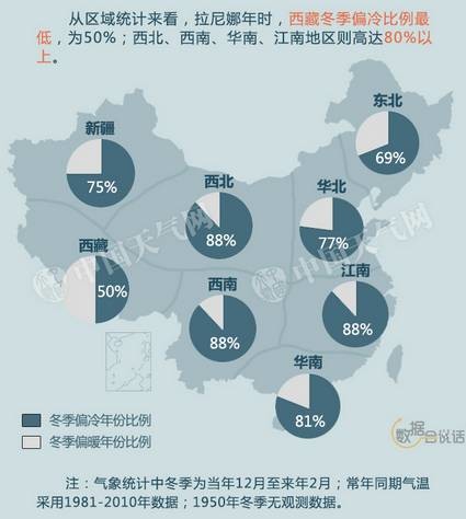 另外,从区域统计来看,拉尼娜年时,西藏冬季偏冷比例最低为50%;江南、华南等地区偏冷概率高达80%以上,而苏州就在这80%以上的地区……