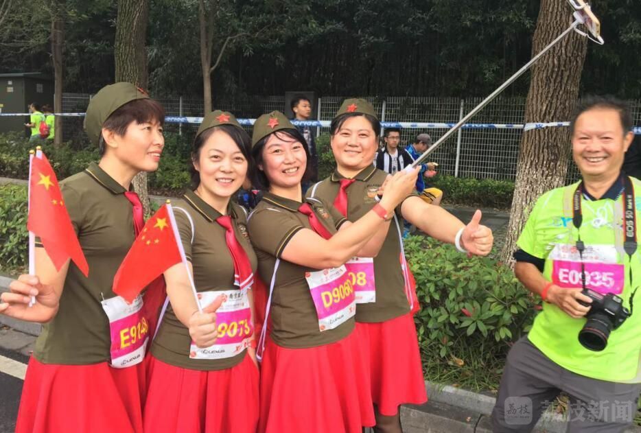 来自盐城响水的跑团队伍,身着水兵服,举着自拍杆直播的四位阿姨平均年龄50岁,她们说跑南马就是来秀出年轻青春的心态