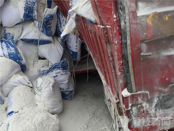 从这张图片中可以看到,一辆红色大货车侧翻在路旁,车上货物撒满一地。记者赶到现场时交警己经调来了清障车,并将侧翻的车身扶了起来。而在车身北侧的车斗己经损坏,车厢里的建筑装璜用白粉撒落成堆。据货车驾驶员说,事发前他驾驶该车自西向东行驶,当行驶该路段时突然觉得车身不受控制,瞬间便翻倒在地,一切是那样的突然,侧翻原因为左后轮突然爆胎,该车是否超载正在进一步调查中。