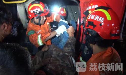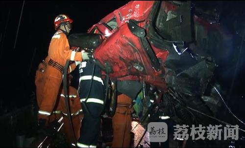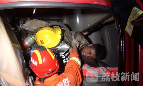 记者冒雨赶到事故现场时看到,消防官兵正在对厢式货车驾驶员进行救援,受伤的驾驶员神志清醒,一名身穿雨衣的中年男子仰面躺在由北向南的快车道里,不停地抽搐,几名亲属打着雨伞围在旁边,在由南向北的车道边上,一名男子头部受伤,流血不止。记者在现场看到,一辆二轮摩托车侧倒在由北向南的车道边上,塑料行李箱损坏,一辆大货车逆向停在由南向北的车道里,车头与车厢呈九十度,整个驾驶室变形脱落,被抛在十字路口的中央,一辆厢式货车头朝西北横停在十字路口北侧的车道里,占据了由南向北的三股车道,导致该路段同行中断,由南向北车辆大量积压,为确保救援消防官兵的安全,防止过往车辆发生二次事故,射阳警方随即指令临近的盐场、洋马两个派出所的警力增援,协助交警疏导、指挥由北向南方向的车辆缓慢通过事故路段。120救护车赶到现场后,迅速将摩托车驾驶员和大货车上两名驾乘人员接送到医院抢救。由于厢式货车受到严重的撞击,整个驾驶室前翻,变形的方向盘顶住驾驶员的下腹部,致使驾驶员无法动弹,由于空间狭小,给救援工作带来不小的难度,消防官兵动用大力剪、扩张器等工具,经过一个多小时的努力,才将被困的驾驶员成功救出变形的驾驶室。据摩托车驾驶员的亲属讲,摩托车是由北向南左拐弯朝东的,结果被后面的大货车给撞,而大货车在采取打方向紧急避让过程中,又冲到对面的车道里,与厢式货车发生了碰撞。另两名受伤较轻的男子告诉记者,他们分别是睡在两辆货车上的驾乘人员,事发时他们正在睡觉,也不知道是什么情况。