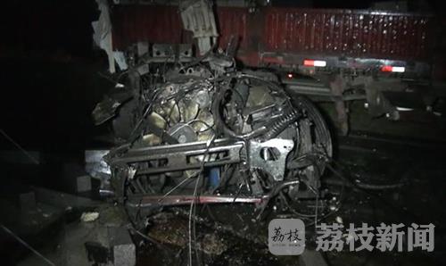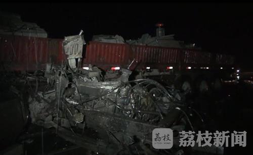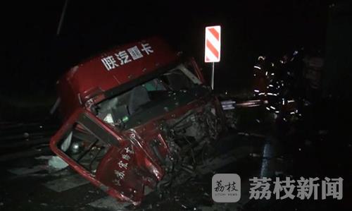 10月20日晚上10点钟左右,在省属射阳盐场境内的228国道2638号桩南侧的一个无灯控十字路口,一辆由北向南行驶的大货车在避让一辆同方向行驶准备左拐弯的摩托车时,与摩托车发生碰撞后,又冲进左侧车道里,与迎面而来的一辆厢式货车发生剧烈碰撞,厢式货车驾驶员被困在变形的驾驶室无法动弹,事故导致三辆车上的五名驾乘人员不同程度受伤,两货车车头基本报废。