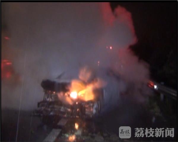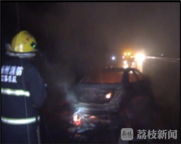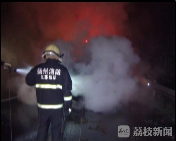 10月20日晚6点,启扬高速扬州郭村服务区附近,一辆轿车因雨天路滑发生失控,撞上路边护栏,并引发自燃。