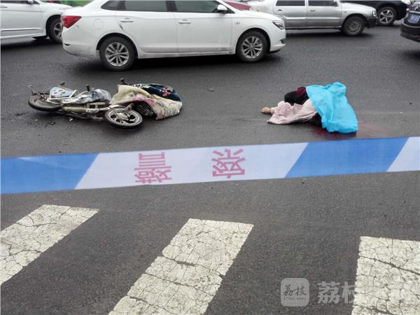 记者赶到现场时,被撞女子和电动车还留在事发路段,女子已经没有生命体征、肇事大货车也停在马路中间。
