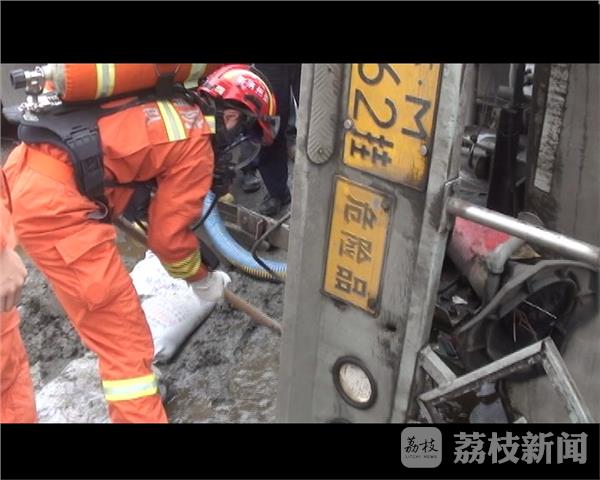 在现场,槽罐车横卧在马路上,占据了大半幅路面,罐体阀门处不断有液体流出,并伴有一股刺鼻的气味。为了防止泄露液体流入路边的河沟里,污染河水,消防队员在路边堆起土堆进行阻挡,同时一边堵漏,一边用水枪对泄露气体进行稀释。