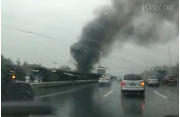 今天(10月26日)上午9点左右,沪宁高速无锡梅山段发生一起交通事故,一辆轿车与一辆大货车由东向西行驶,走到该路段时两车发生追尾,事故引发轿车失火,现场很远就能看到浓烟滚滚,事故现场人员伤亡情况不详,具体事故原因有待警方进一步调查。