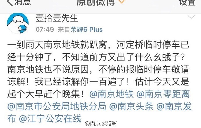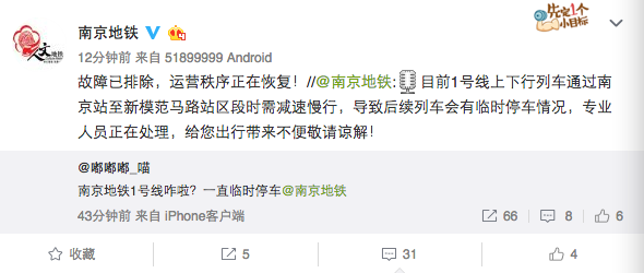今晨,不少上班族发微博@南京地铁称,一号线又出故障了…