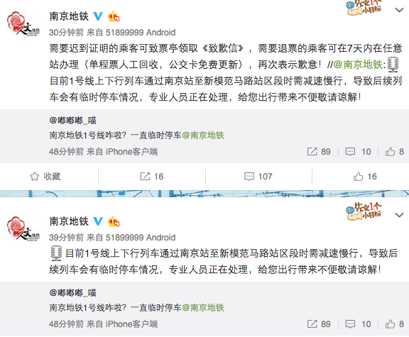 八点十五分左右,南京地铁官方微博表示:目前1号线上下行列车通过南京站至新模范马路站区段时需减速慢行,导致后续列车会有临时停车情况,专业人员正在处理,给您出行带来不便敬请谅解!需要迟到证明的乘客可致票亭领取《致歉信》,需要退票的乘客可在7天内在任意站办理(单程票人工回收,公交卡免费更新),再次表示歉意!