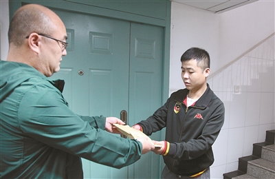 昨天下午,5家出租汽车公司的哥的姐的爱心捐助款送到张辉手中。 记者 秦媛 摄