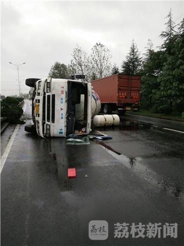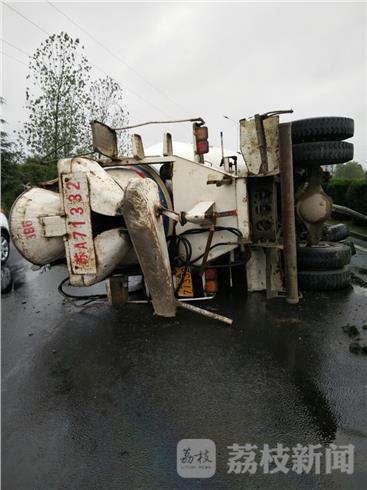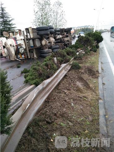 10月27日上午十点多钟,在双龙大道江宁区秣陵街道周里社区附近,一辆由北向南的混凝土搅拌车由于车速过快,在碰到一辆小车后,因避让不及冲过中间绿岛翻在对面车道,所幸对向车道没有车,并没有发生二次事故。
