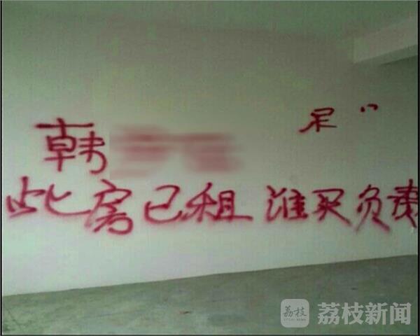 前两天,买房的业主跟小区工作人员一起验收新房,意外发现房门打不开了。现场照片显示,在屋内的一面墙上,用红漆写着一个与业主不一致的名字和“此房已租,谁买负责”几个大字,这让业主既诧异又恼火,并在第一时间报了警。民警首先排查了该小区的住户,果然,这里真有一个与墙上所写名字一样的住户,韩某某。派出所去了解情况 ,韩某某承认,他确实跟人家有经济纠纷,欠人家钱。