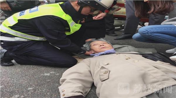 在徐州市老市政府门口,有个老太太突然摔倒了,躺在那一动不动,眼睛也是闭上的,话也不能讲。交警到达现场时,市民们已经拨打了120,警官再次进行确认。