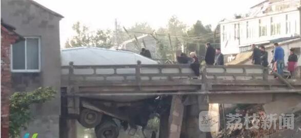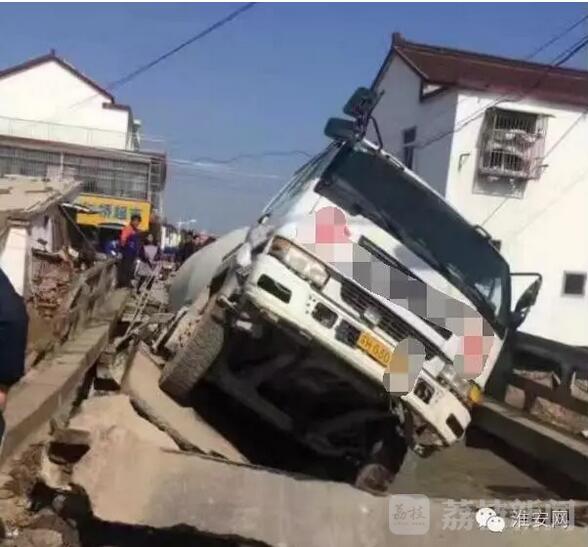 淮安车桥镇一座乡村桥梁被一辆混凝土搅拌车压断,由于附近道路狭窄给救援带来一定难度。