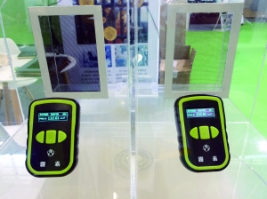 3日上午,在1号展览馆,一个两层三格的塑料盒子引起了不少人的注意。现代快报记者注意到,这个塑料盒子里放了一黑一白两片纱窗“小样”,每个纱窗前还摆放了一个雾霾指数测量器,盒子底部则点燃了一个蚊香和一根香烟。