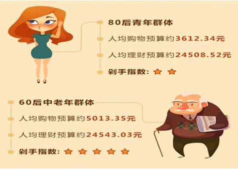 值得一提的是,60后人群与70后、80后和90后相比,以往常常被认为是网购中的一小撮群体,对网购存在排斥心理。但数据表明,这一现象正在快速扭转。挖财2015年的数据显示,2015年“双十一”,60后人群人均消费高出80后人群42.8%。而今年的挖财数据显示,“双十一”,60后人群的人均消费预算在5013.35元以上。