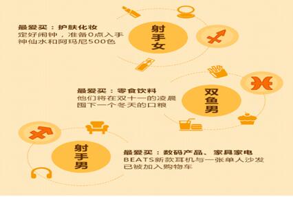 挖财双十一大数据报告还分析出了十二星座的购物偏好。其中射手女最想购买的是护肤品,双鱼男则是吃货一枚,射手男则是数码项目爱好者……