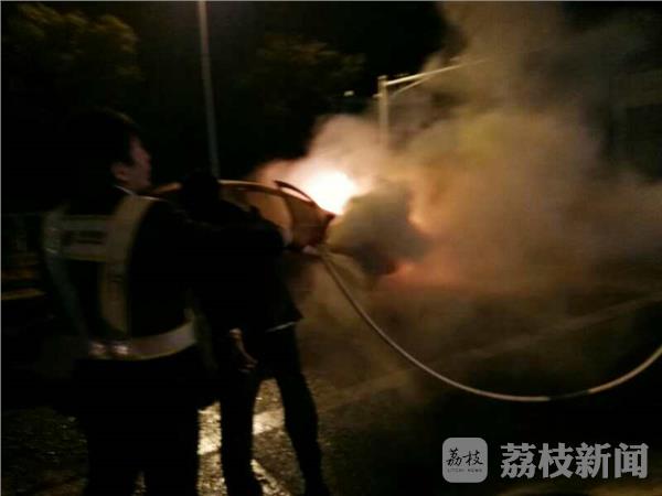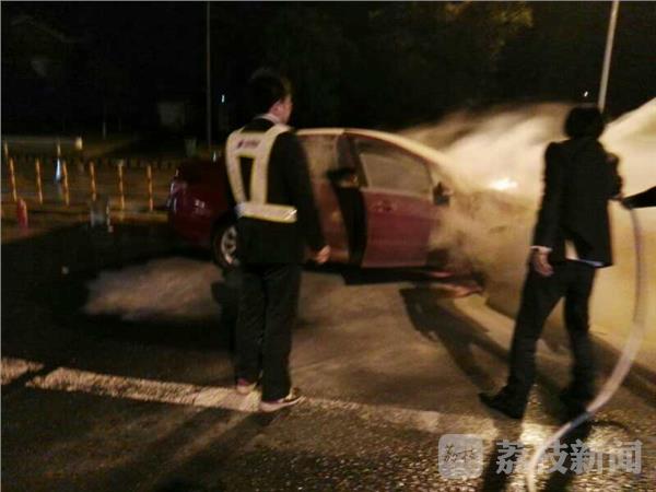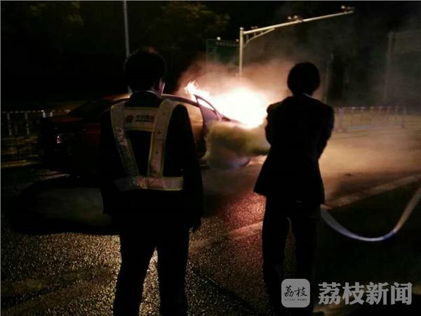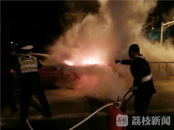 昨天(11月7日)晚上6点多,在沪宁高速汤山收费站的出口处,一辆轿车突发自燃,紧急时刻,收费站收费员第一时间将车主撤离到安全地带,并组织工作人员及时将车辆大火扑灭。