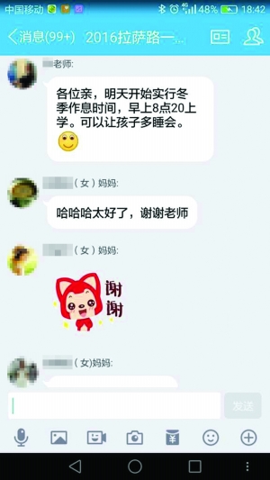 今天起,南京市拉萨路小学的孩子们可以多睡半个小时再去上学!现代快报记者了解到,11月8日下午,学校通过QQ、短信等多种方式通知家长,11月9日开始,拉小实行“冬令时”作息,周二到周五8:10—8:25之间到校,8:30上课。而不少小学是7:40,最迟不超过8点到校。拉小的家长收到这个消息,纷纷为学校点赞。
