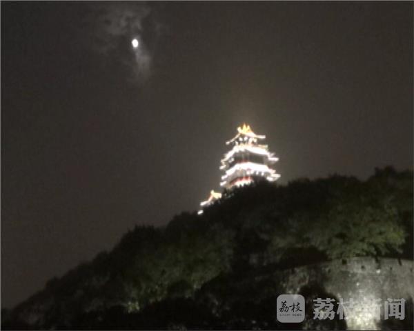 除了紫金山,不少市民还选择到阅江楼赏月,在这里确实有着一番不一样的风味,狮子山顶光彩熠熠的阅江楼和空中的明月交相呼应,而山脚下护城河水绕着古城墙缓缓流淌,一轮明月倒映其中,着实增添了一份异彩。