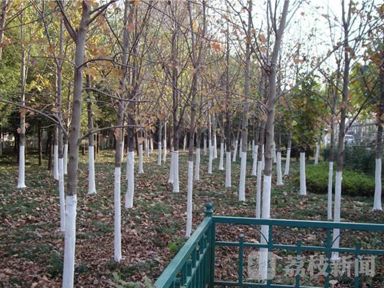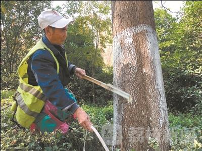 据介绍,所谓防护衣就是树身上常见的白色涂料。刷白的主要成分是石灰、盐、水和少量农药。冬季,树枝树干上的病虫沿着树身爬入地下过冬;开春,土壤里的病虫又会顺着树干爬上枝干。在树木的根茎部位刷白,阻断了病虫上下迁移的通道,杀死了寄附在根茎部的害虫和病菌。