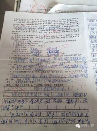 这篇文章看哭了阅卷老师,忍不住把它发到了网上。很快,沭阳县公安局交巡警大队的官方微信转发,感动了更多网友。