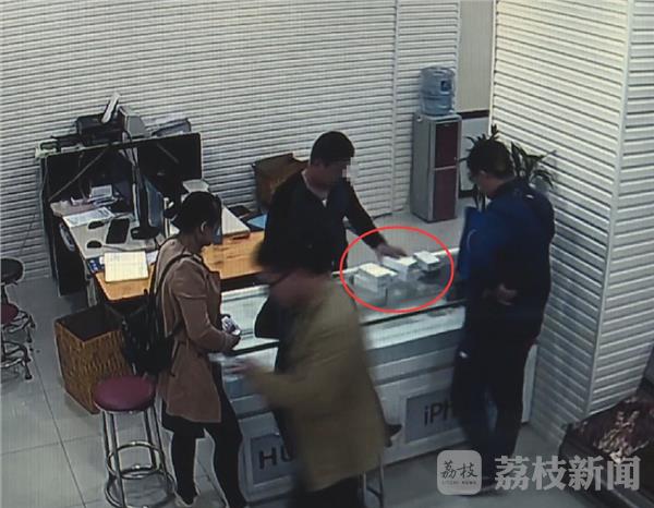 监控画面中就是徐州万虹桥附近的一家手机商铺,11月11号,画面中的男子正在柜台上与店主交易10部iphone6s手机,交易成功后没多久,店主报警,说自己被骗,买了十部苹果手机模型。