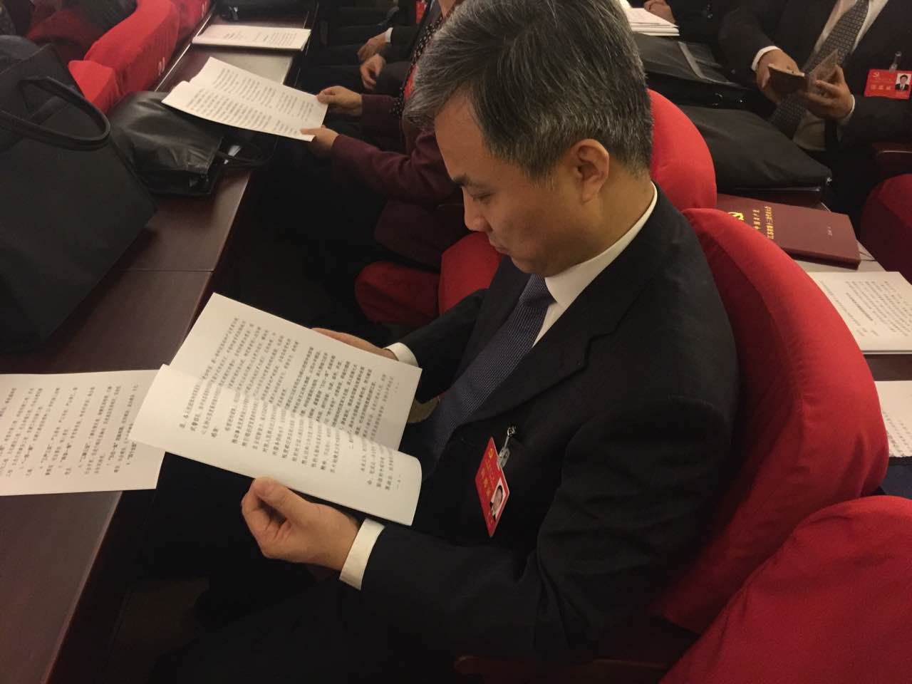 参加了三次党代会的侯晶晶到达会场,正在看材料,做大会准备工作。