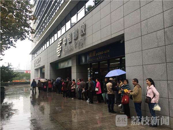 11月21日,2017新邮预订工作正在如火如荼地进行中,今天上午,南京近百市民冒雨来到南京龙蟠路上的邮局进行线下预订以及补办集邮联名卡。