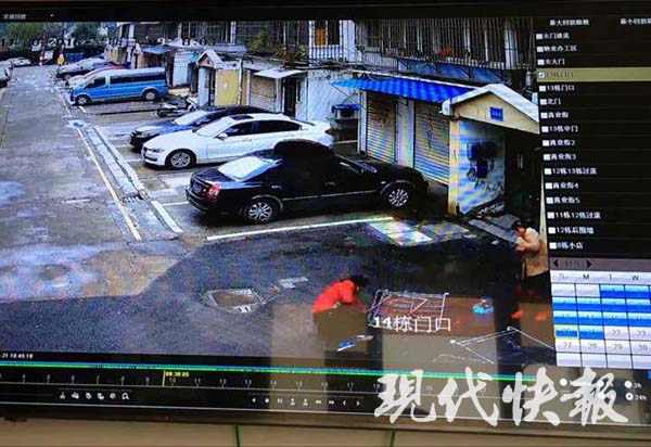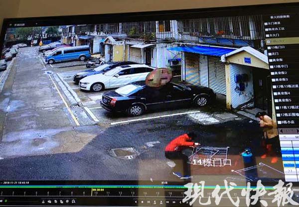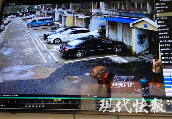 11月21上午,现代快报记者通过小区内的监控看到,当时男子正弯腰面朝地,用火枪对宠物笼子消毒,作业的位置就在一个污水井盖上方,几分钟后,井盖忽然弹起,飞起三四米高,正中男子面门。之后男子被送往医院救治。