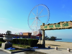 酒店对面的欢乐岛,由于是淡季,景区游客不多。高达122.5米的摩天轮正对着大门,有游客在下面拍照,但摩天轮没有开。