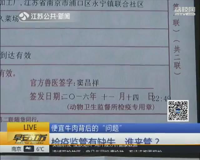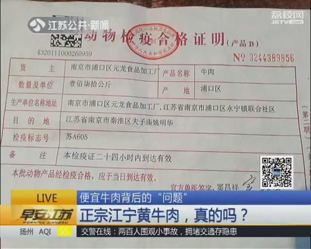 当记者在店内购买牛肉,并索要检疫票据时,店方提供的却是南京市浦口区元龙食品厂的检疫证明。而经过多天跟踪记者发现,送货的苏A 7A2Z8面包车确实是从浦口区永宁街道的一个大院内开出来的。