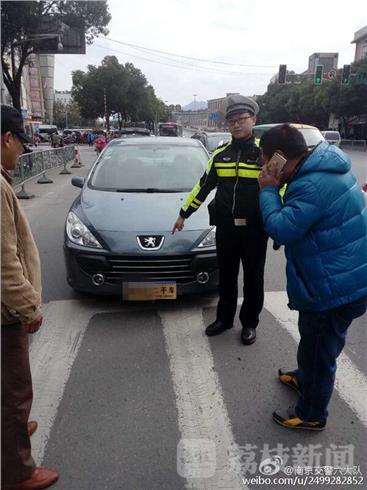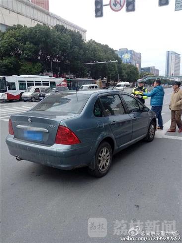 11月29日上午,南京交警六大队民警在建宁路玉桥市场路口执勤,约10点50分左右,一辆小型轿车在路口违法鸣笛,民警上前拦下车辆。