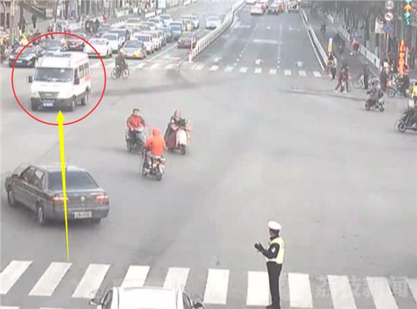 早上8点多钟,泉山交警大队的民警中山路和建国路的交叉口指挥交通,此时一辆安徽拍照的救护车亮着警灯从北向南行驶过来。此时南北方向是红灯,这辆救护车进入左转道后,直接直行闯红灯驶离路口。