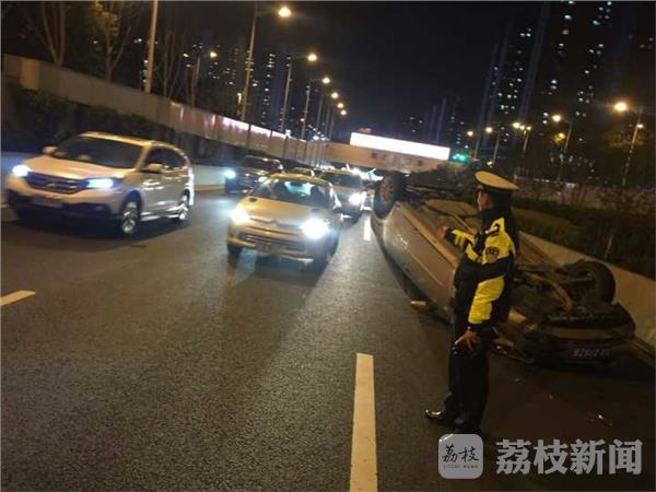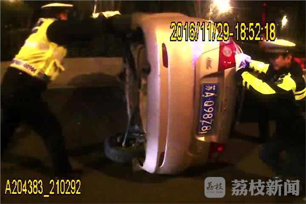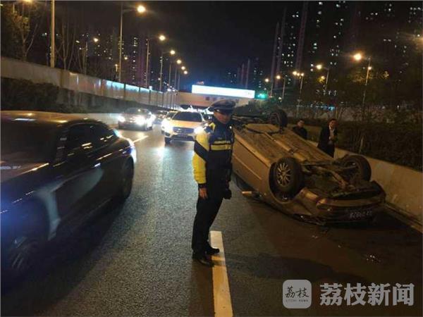 11月29日交通晚高峰期间,南京江东北路管子桥隧道由南向北出口处一辆轿车翻车,五大队五中队民警接警后迅速赶到现场,民警们边疏导交通,边和清障人员一起研究如何将车快速翻过来,最终在大家一起合力将侧翻的车给翻了过来,迅速恢复了交通。