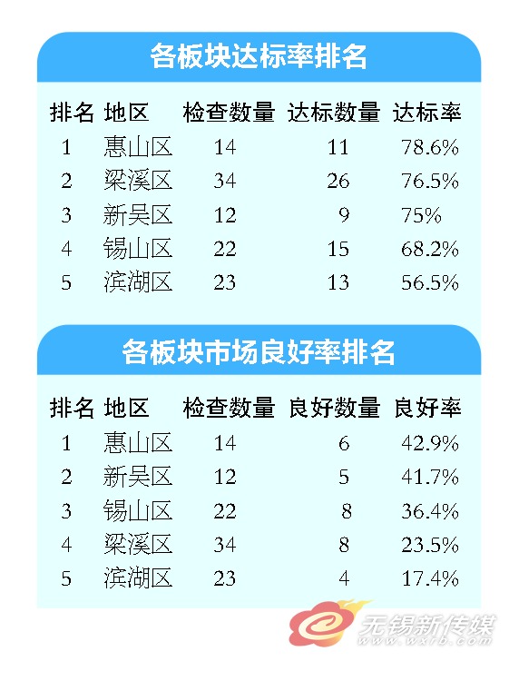 综合整治阶段的总体结果表明,从板块来看,惠山区应检14家农贸市场,以78.6%的达标率位居板块之首;滨湖区达标率56.5%位于板块末位。从良好率来看,惠山区以42.9%位居板块之首;新吴区良好率41.7%,以微弱差距紧随其后;滨湖区应检23家农贸市场,良好率为17.4%,位于板块末位。
