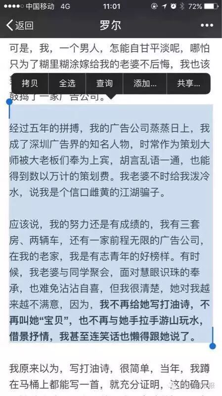 南都记者发现,罗尔本人于今年7月5日在个人公号上发文描述,其岳父母均为大学教授,丰衣足食。其本人经营广告公司,有三套房产、两台车。