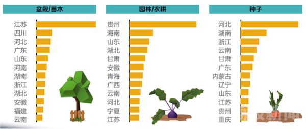 例如,东北地区对盆栽/苗木、园林/农耕及种子的需求量远远大于其他品类,体现出该地区土地、水和森林资源丰富,以农林业为主的特点;而新疆、甘肃、青海中西北部地区等依靠灌溉的绿色农业和荒漠放牧业为主的地区,除需要大量的肥料之外,对兽用器具、兽药等也有一定需求。江苏、四川、河北对盆栽/苗木的需求较高,贵州、海南、山东则对园林/农耕产品更加需求,河北、湖南及浙江则尤爱在网上购买种子。