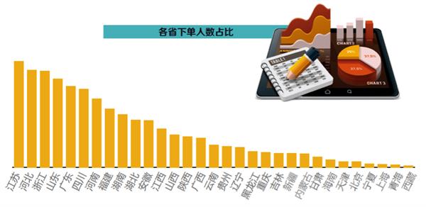从下单人数来看,2013年至2015年各省市农村地区下单人数逐年大幅增加,其中尤以甘肃、福建、江苏尤为明显,2015年增速超过160%。值得注意的是,江苏省不仅下单人数总量居前,增速也较快,显示出该地区农村居民旺盛的需求。