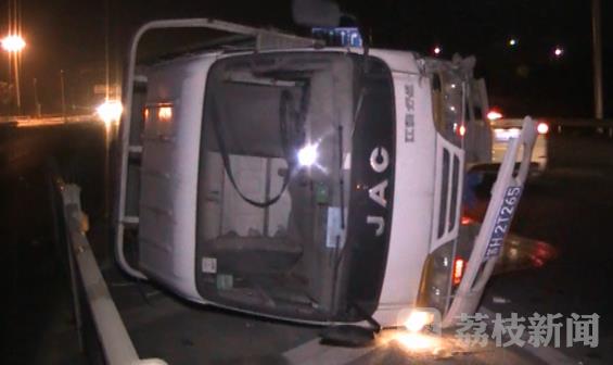 荔枝新闻记者在宁连公路上看到路中间隔离护栏旁侧翻了一辆轻型货车,货车前车和右侧损毁严重,地面上散落着部分车体碎片,底盘破损导致机油外泄在路面上,而现场隔离护栏却没有发生损毁。