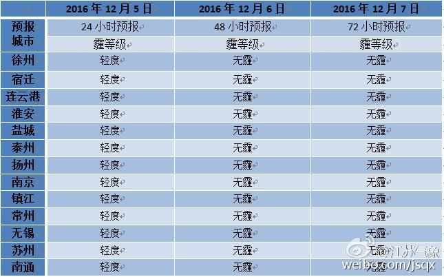 江苏霾分区预告:5日全省轻度霾霾;6日,7日全省无霾。