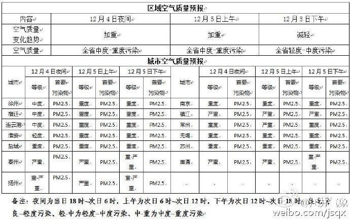 今天夜里到明天上午全省空气质量中度-重度污染,明天下午轻度-中度污染。预报由江苏省气象台和江苏省环境监测中心联合发布