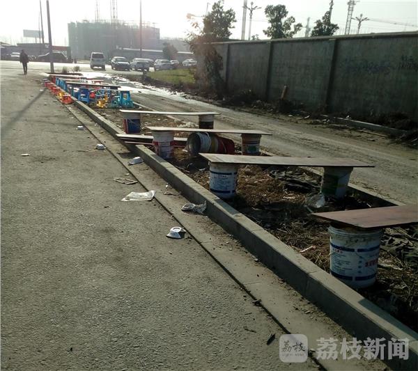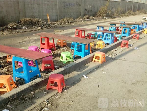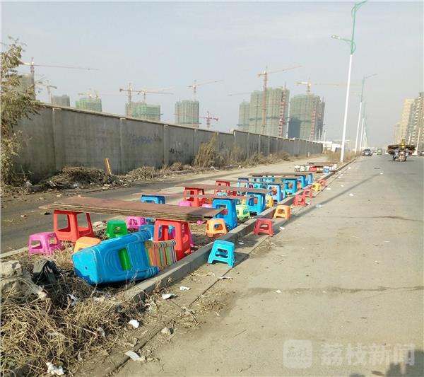 昨天(12月4日)上午九点多钟,路过南京市六合区龙华东路时被路边被近百只板凳吸引住了,觉得好奇下车看看究竟,20分钟左右也没有发现有人在此。在白果南路与龙华东路交叉路口附近,这些塑料板凳和一些油漆桶整整齐齐摆放在路边人行道旁,究竟是干什么用的呢。一位路过的市民直言不讳地说:“这里板凳都是做盒饭生意放置的目的就是就是占地盘。说起这些大排档摊占用人行道经营的行为,市民成先生一肚子的气。他告诉我们,这里是开发较为集中的地方,工程队比较多,也是大排档摊点较为集中的地方,一到用餐时候,这里人声鼎沸,道路边的人行道上不是停满了非机动车、机动车,就是被大排档霸占,搞得市民走路都没地方,只得冒险走机动车道,而且环境也搞的一塌糊涂,环卫工人也是叫苦不迭。路边摆设大排档对交通安全、食品卫生确实有很大的影响,希望相关部门能合理规划,从根本上解决占道经营的问题。