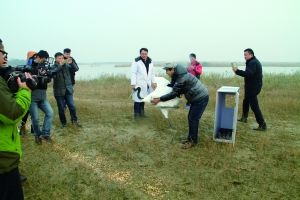 12月3日12时30分,“小五”抵达南京禄口机场,随后搭乘一辆面包车前往盐城国家级珍禽自然保护区。傍晚6点多,这只享受特殊待遇的丹顶鹤运抵盐城。在工作人员的帮助下,“小五”搬进了它在保护区临时的家。